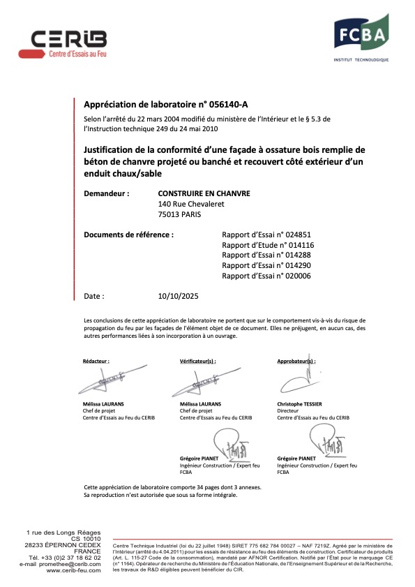 Le document AL 056140-A du CERIB/FCBA remplace l’appréciation de laboratoire AL 026090. Il actualise la justification de conformité au feu des façades à ossature bois remplies de béton de chanvre selon les nouvelles règles professionnelles 2024 et les références réglementaires en vigueur en 2025, étendant le domaine d’application aux murs porteurs à ossature bois.